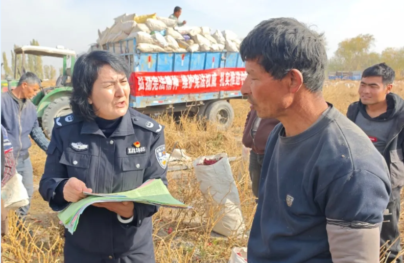 近日,巴州焉耆县司法局查汗采开司法所联合兵团第二十一团司法所组建普法宣传小队,深入辖区田间地头开展法治宣传,秉承“群众在哪里,普法阵地就在哪里”的理念,紧扣务工人员实际需求,打造“移动法治课堂”,讲解民法典及保障农民工工资支付条例等法律法规,发放口袋宝典等资料,开展“零距离”答疑,现场摸排劳资、用工等纠纷隐患,持续深化兵地协作。