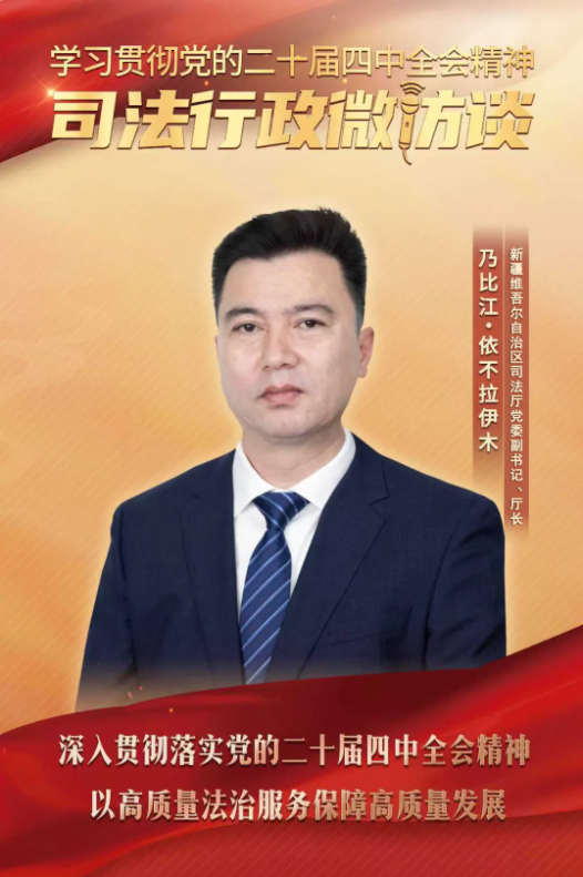 为做好党的二十届四中全会精神学习宣传贯彻工作,及时反映司法行政系统学习贯彻全会精神、推进工作发展的体会收获和具体举措,形成学习贯彻的良好氛围,我们策划推出“学习贯彻党的二十届四中全会精神——司法行政微访谈”节目,今天邀请到的访谈嘉宾是新疆维吾尔自治区司法厅党委副书记、厅长乃比江·依不拉伊木接受访谈。