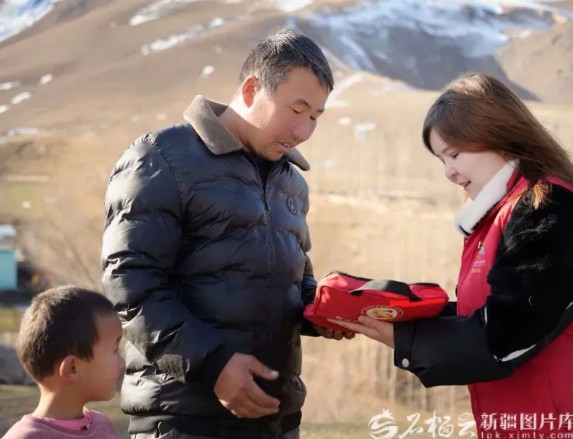 巴给娜·塔依尔(右一)给新源县那拉提镇塔依阿苏村村民赠送医疗包(资料图)。