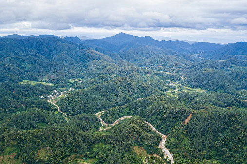 这是2025年7月22日在海南省保亭黎族苗族自治县毛感乡拍摄的热带雨林及蜿蜒其中的环热带雨林国家公园旅游公路(无人机照片)。