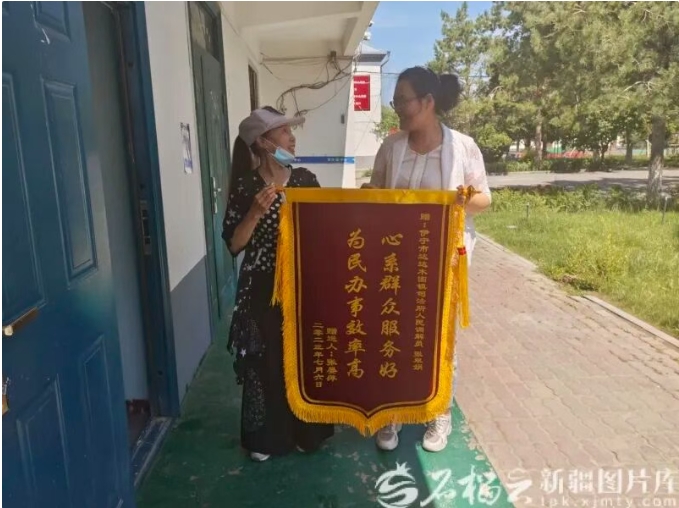 伊犁哈萨克自治州伊宁市达达木图镇司法所人民调解员张翠娟(右一)收到群众赠送的锦旗。